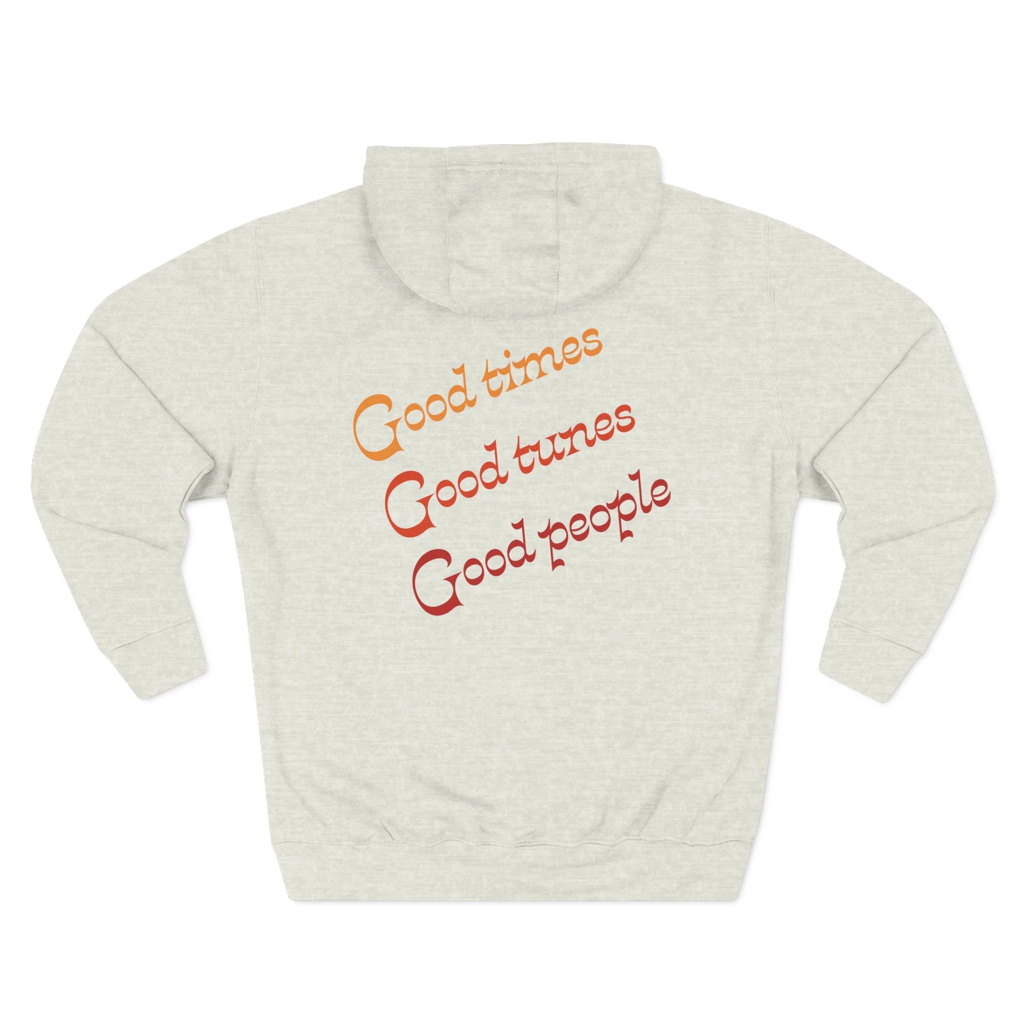 Fleece Hoodie with Rambling House Music Bar logo on front and "Good Times / Good Tunes / Good People" text on back. Available in Charcoal, Oatmeal, and Green with retro rainbow logo and Black with circle logo.