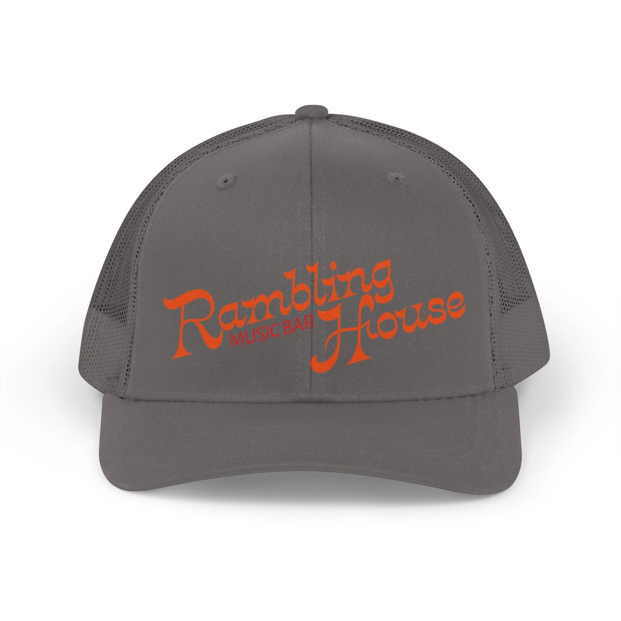 Trucker Hat with printed Rambling House Music Bar logo. Available in four color combinations with varying designs.