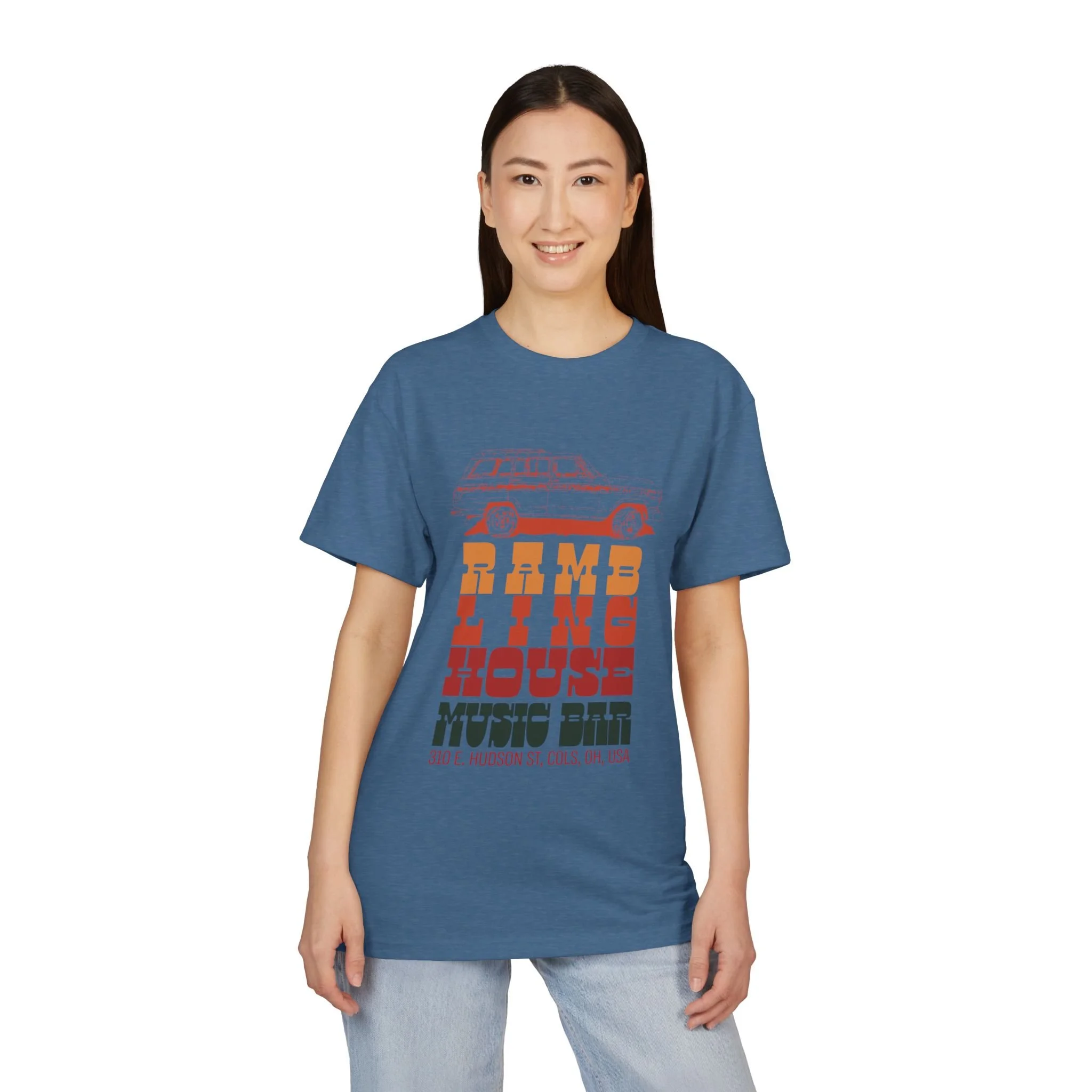 Lightweight tee shirt with Woody Rambling House Music Bar logo on the front. Available in White, Heather Gray and Blue.